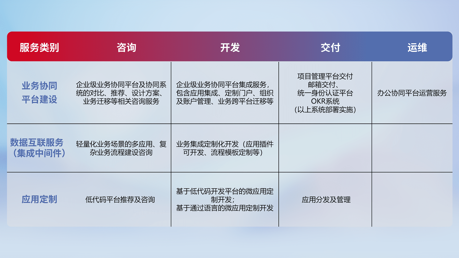 针对钉钉、、、、企微、、、、IDaas等平台级产品提供产品的规划、、、方案、、、交付、、、、定制化开发等服务,,,,实现如统一协同办公、、智能客户服务、、混合会议管理、、、、智能数据查询、、、、等业务场景,,实现数字化转型。。