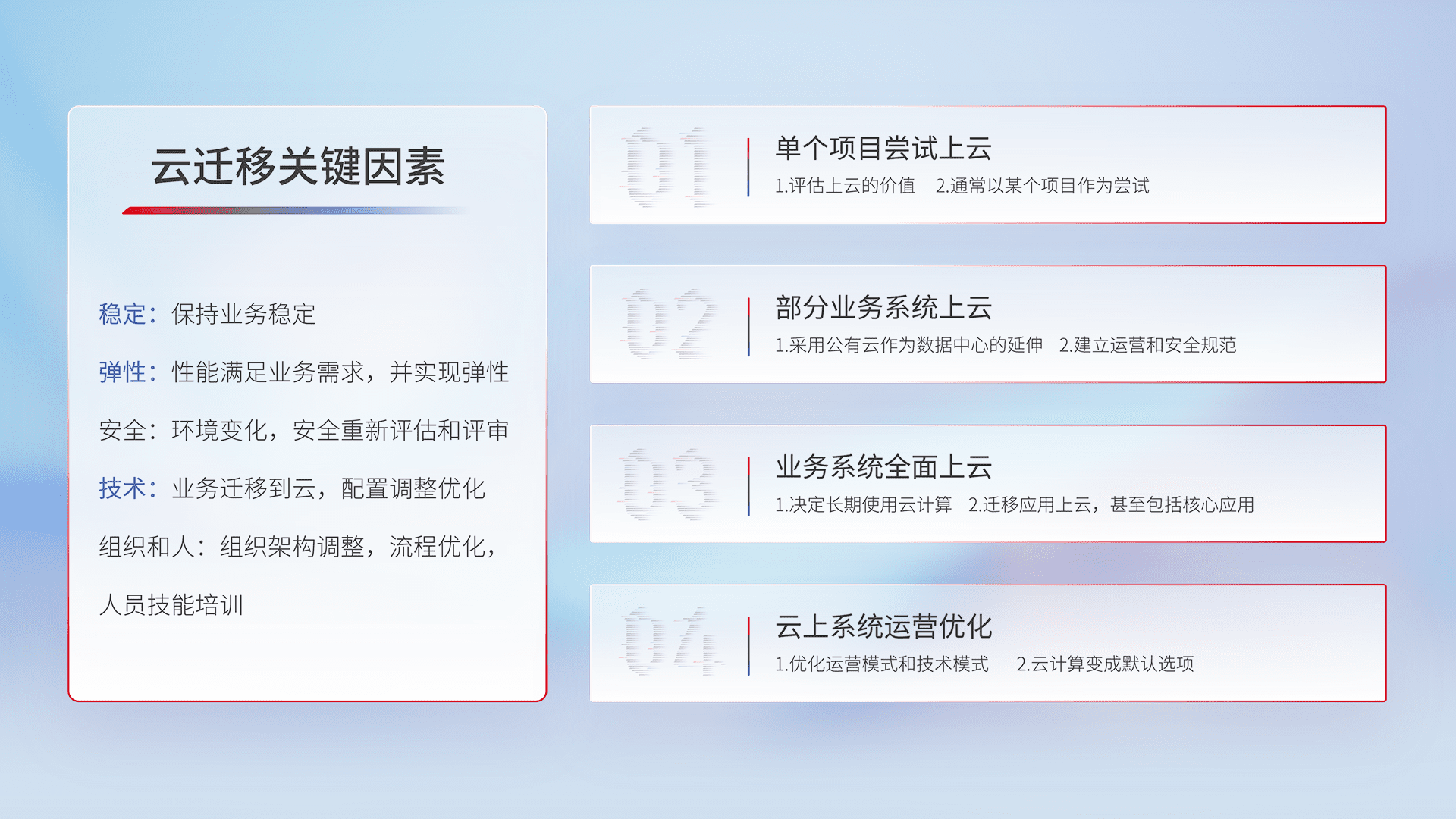 结合实际业务,,,,从规划设计、、、、云平台选型、、、云原生改造、、、、数据迁移、、集成交付,,,,迁移全过程为客户识别最佳上云路径,,,做好风险识别管理,,,设计网络架构、、、身份权限、、、、安全审计合规、、、、操作审计、、、、日志审计、、监控告警策略、、多站点容灾设计等,,,对云上基础设施进行整体规划,,,,提升IT治理水平,,,,以满足弹性、、、高可用、、高性能的需求。。。。