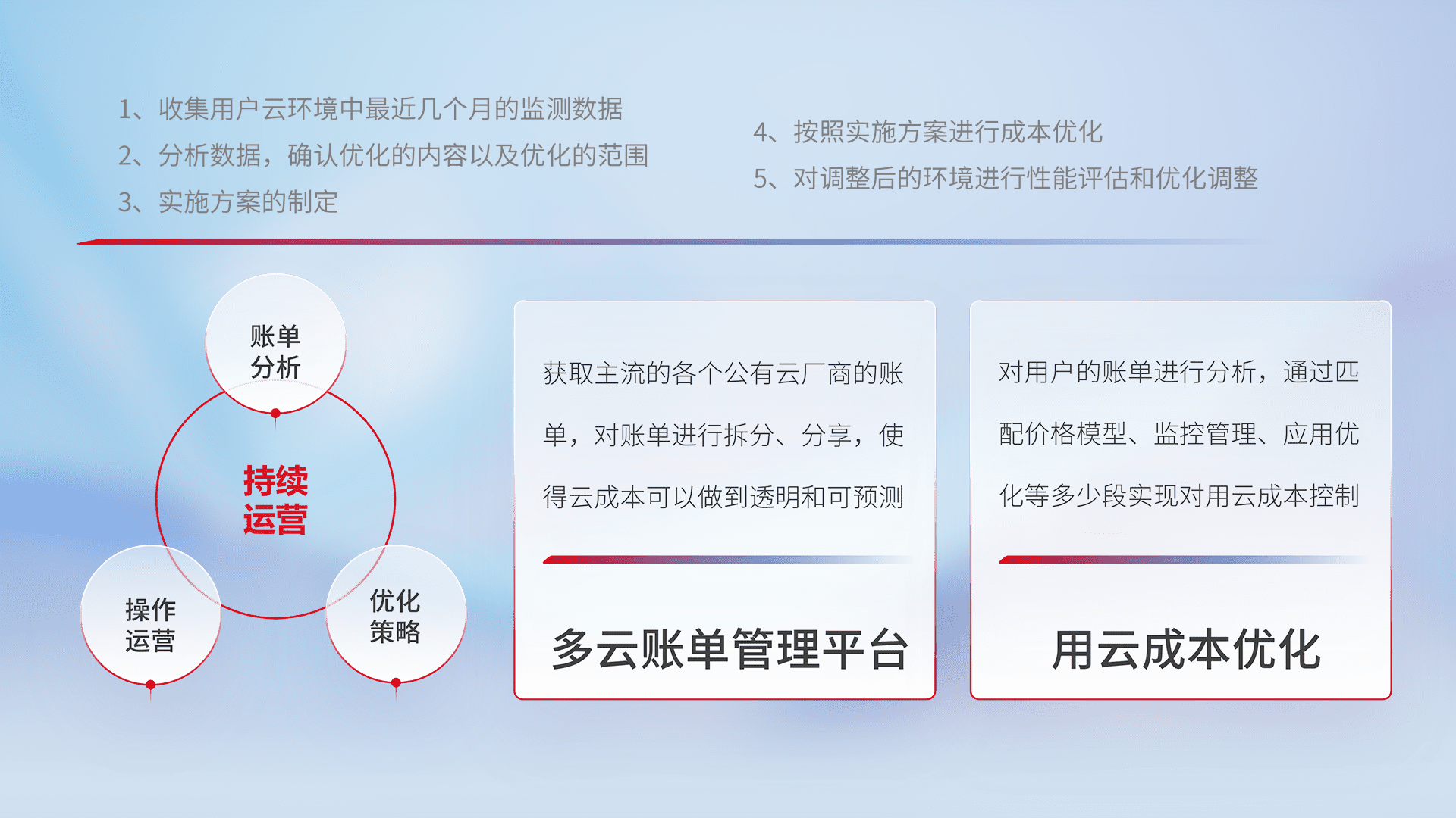 通过多云纳管,,,,以统一的资源数据模型把客户的云资源进行抽象和封装,,,进而实现对多云资源的统一操作,,,保障云资源管理的可靠性、、、、稳定性与可用性。。。。量身定制化运维内容,,配置、、、开发运维、、补丁管理、、、备份、、、监控、、、认证和访问管理、、审计和日常巡检等,,,,保障在用云过程中的可靠度,,,稳定度以及高可用率。。。。